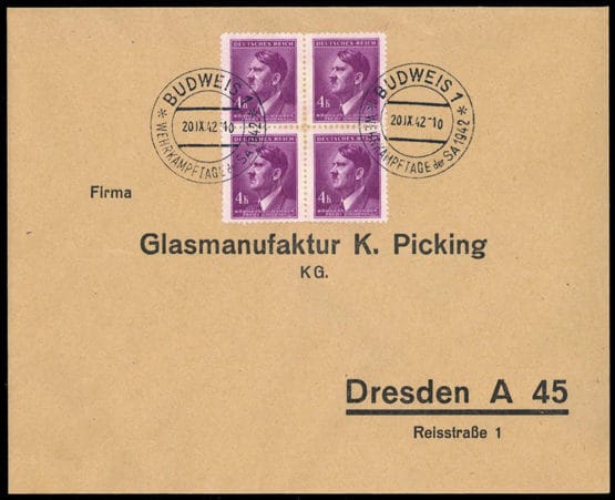 "BUDWEIS 20.IX.42 WEHRKAMPFTAGE DER SA", SST sur phil. Lettre avec 4 x 4 K. Hitler à Dresde