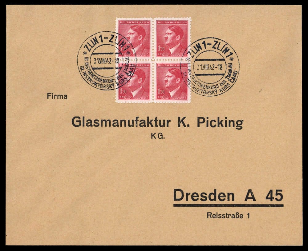 "ZLIN 31.VIII.42 INSTRUKTORENKURS", SST sur phil. Lettre avec 4 x 1.20 K. Hitler à Dresde