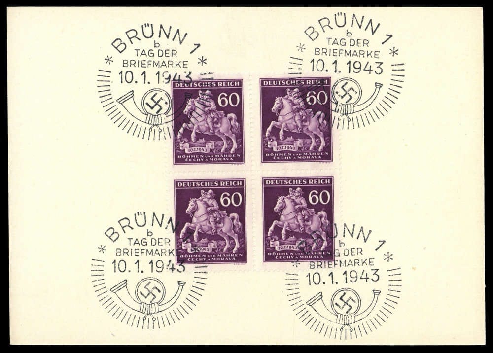 "BRÜNN 10.1.1943 TAG DER BRIEFMARKE b", 4 x SST sur carte vierge avec 60 H. TdB en bloc de quatre