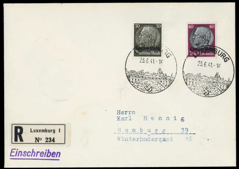 1940, 30+60 Pfg. Hindenburg sur lettre R avec SST "LUXEMBOURG 23.6.1941", adressée à Hambourg, rs. Cachet d'arrivée.