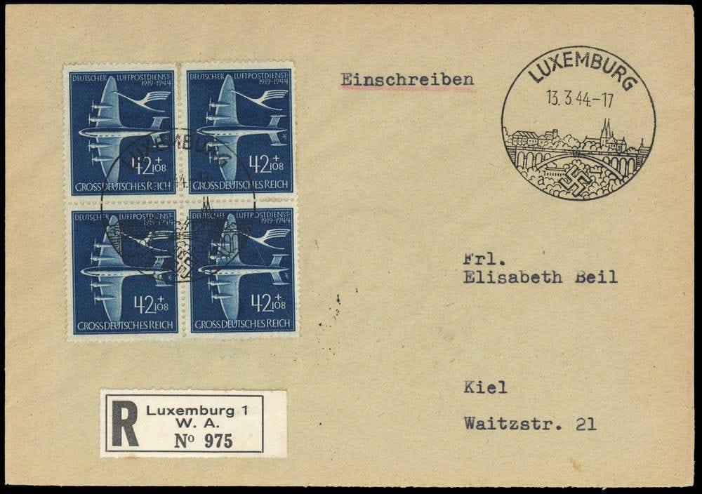 "LUXEMBOURG 13.3.44", SST clair sur DR 42+108 Pf Junkers Ju 90 en bloc de 4, lettre R de collection traces d'âge, Ak-K2 "KIEL 14.3.44