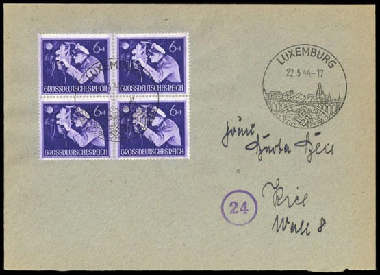 "LUXEMBOURG 22.5.44", SST clair sur DR 6+4 Pf U-Boot/Sehrohr en bloc de quatre, lettre avec traces d'âge, vers Kiel