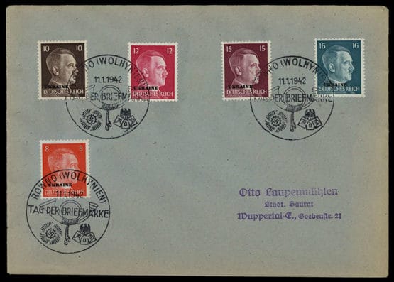 941, 8, 10, 12, 15 et 16 Pfg. Hitler sur phil. Lettre avec SST "Rowno 11.1.42 Journée du timbre"