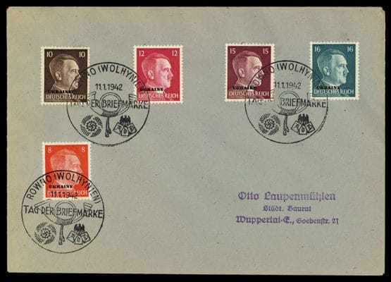 , 8, 10, 12, 15 et 16 Pfg. Hitler sur phil. Lettre avec SST "Rowno 11.1.42 Tag der Briefmarke "