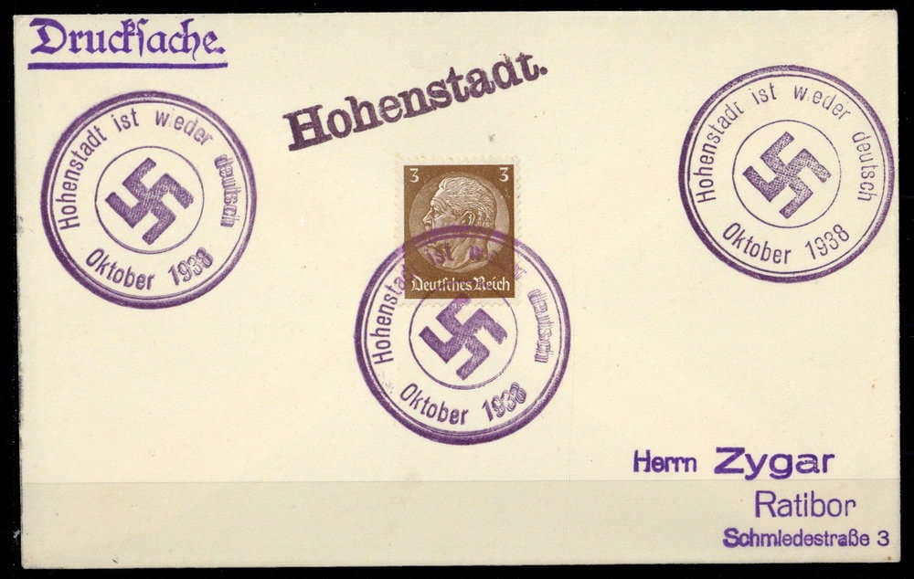 "Hohenstadt est à nouveau allemande octobre 1938 (croix gammée)", vi. K3 sur phil. Imprimé avec 3 pf brun, à côté L1 "Hohenstadt. "