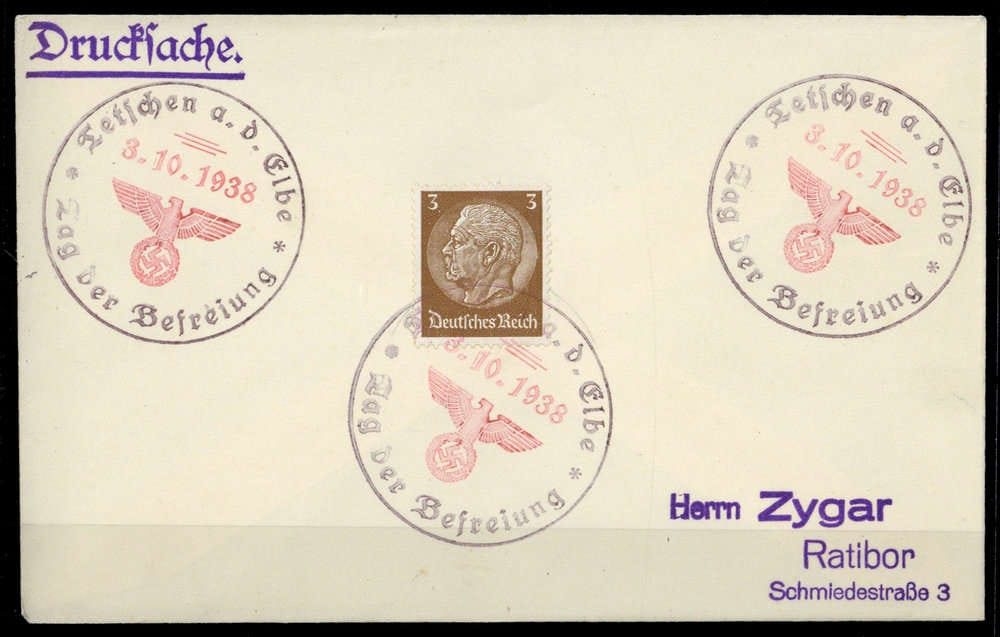 "Tetschen a.d. Elbe 3.10.1938 Tag der Befreiung", K1 bicolore sur phil. Imprimé avec 3 pf brunLos