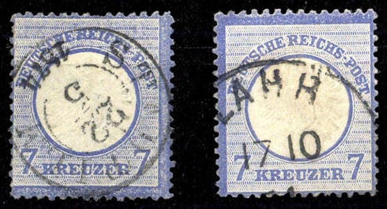 1872, 7 Kr. ultramarin, deux valeurs oblitérées avec des défauts (ME 180,-)