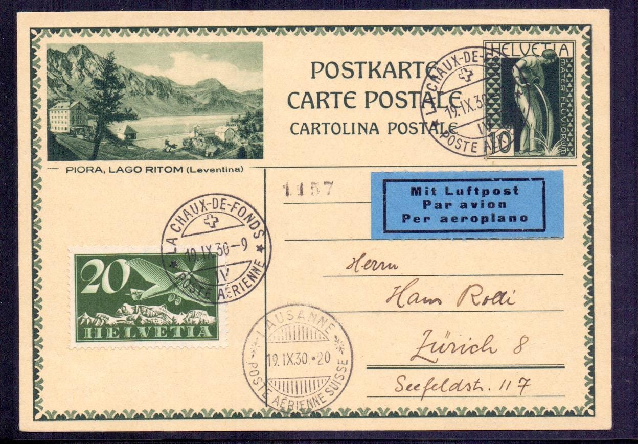 1930, 20 C. Flugpost sur carte postale illustrée 10 C. "PIORA, LAGO RITOM (Leventina)" de "LA CHAUX-DE-FONDS 19.IX.30 POSTE AERIENNE" via LAUSANNE avec autocollant de la poste aérienne vers Zurich