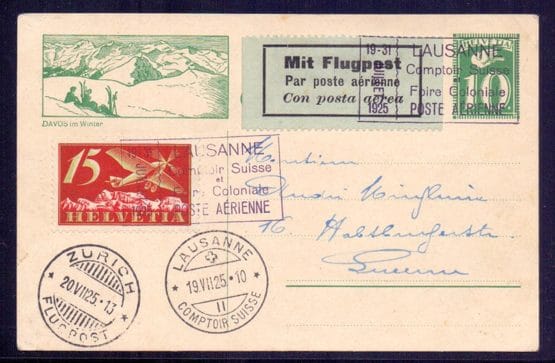 1925, Flugpost Comtoir Suisse Lausanne, GS-Bildpostkarte 10 C. "Davos im Winter" avec 15 C. Flugpost via ZÜRICH à Lucerne, SLHB SF 25.5