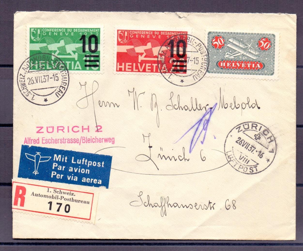 | 1937, "ZÜRICH 2 Alfred Escherstrasse/Bleicherweg"", ng. L2 sur lettre R avec 3 timbres de la poste aérienne au départ de "1.SCHWEIZ. AUTOMOBIL-POSTBUREAU 26.VII.37" vers Zurich avec cachet Ak., autocollant de poste aérienne, traces de transport Lot n° 9196-1696500422 |