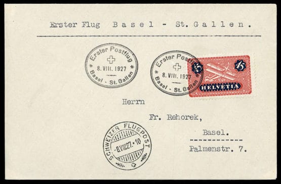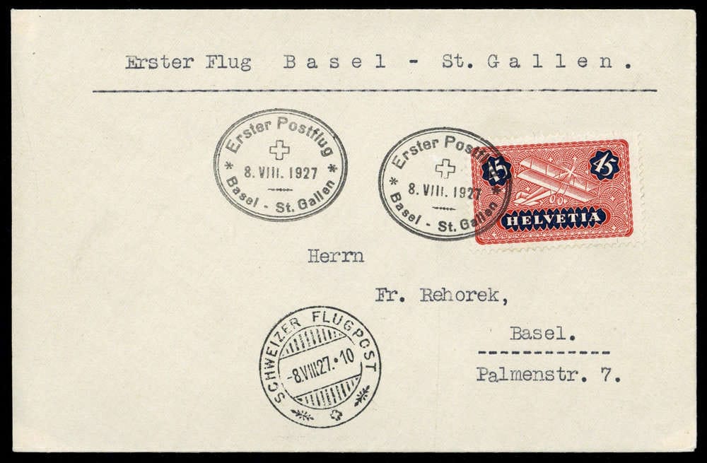 1927, Première lettre de vol Bâle-St. Gallen 8.VIII.27 avec 45 C. Flugpost
