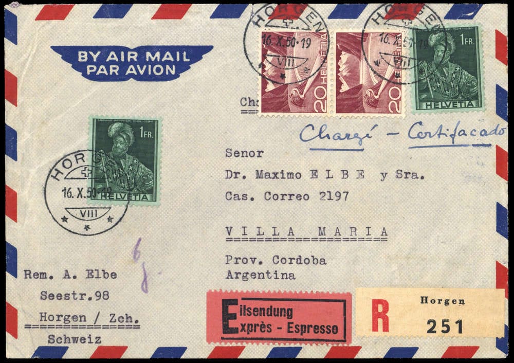 1950, 1 Fr. Représentations, deux valeurs avec la paire n° 533 ensemble sur lettre de courrier express Luftpost-R de HORGEN 16.X.50 à Villa Maria / Argentine, rs. Défauts d'ouverture, enveloppe présentant de légères traces de vieillissement.