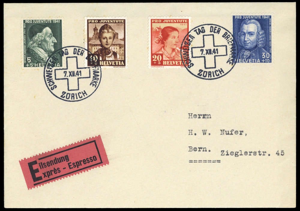 "SCHWEIZER TAG DER BRIEFMARKE 7.12.1941 ZÜRICH" deux fois sur lettre de courrier express avec les n° 399-402 affranchis à Berne, timbres en partie un peu brunis.