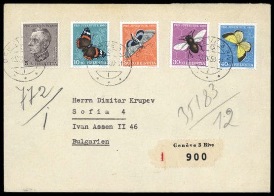 1950, Pro Juventute, 5 valeurs complètes sur lettre en R de GENEVE 13.12.1950, adressée à Sofia / Bulgarie, légères traces d'ouverture et de vieillissement.