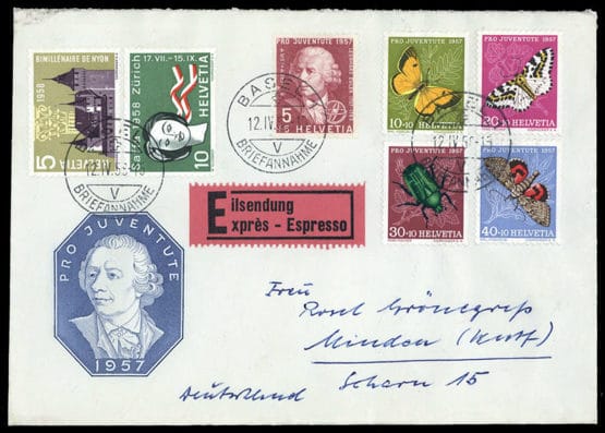 1956, Pro Juventute, 5 valeurs complètes avec les n° 653+654 ensemble sur enveloppe décorative comme courrier express de BASEL 12.4.1958, adressée à Minden, dos. Mentions de cachet, légères traces d'ouverture.